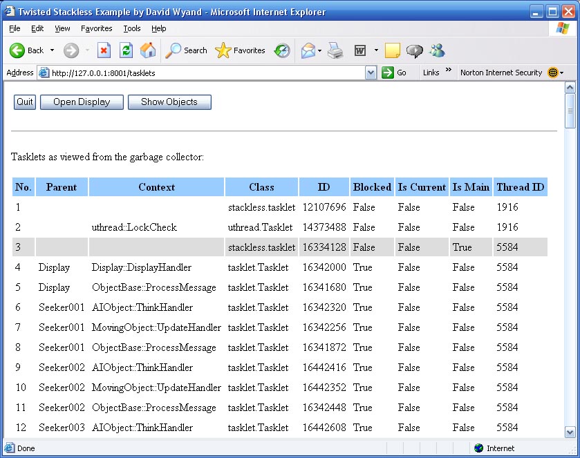 The second web page provides a list of all Stackless tasklets as obtained from the garbage collector. It lists who created the tasklet, what context the tasklet was created under, the tasklet's class, and some additional information that is available from Stackless. The 'main' tasklet is shaded in gray while the current tasklet is shaded in yellow.